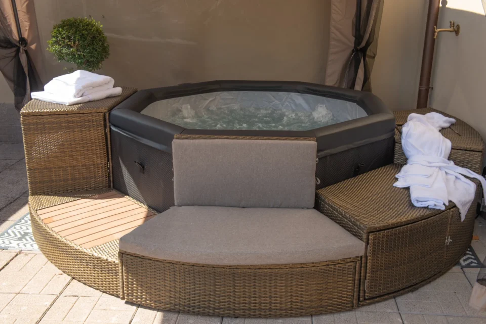 Lussuosa camera con ampio terrazzo, jacuzzi esterna, e comfort moderni. Perfetta per un soggiorno rilassante e indimenticabile, ideale per coppie o piccole famiglie.